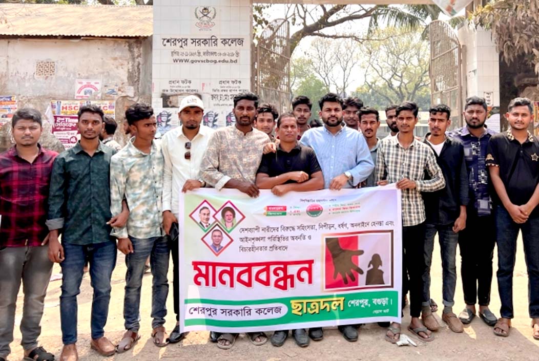 দেশব্যাপী নারীদের বিরুদ্ধে সহিংসতা, নিপীড়ন, ধর্ষণ, অনলাইনে হেনস্তা এবং আইনশৃঙ্খলা পরিস্থিতির অবনতি ও বিচারহীনতার প্রতিবাদে বগুড়ার শেরপুরে মানববন্ধন করেছে জাতীয়তাবাদী ছাত্রদল।