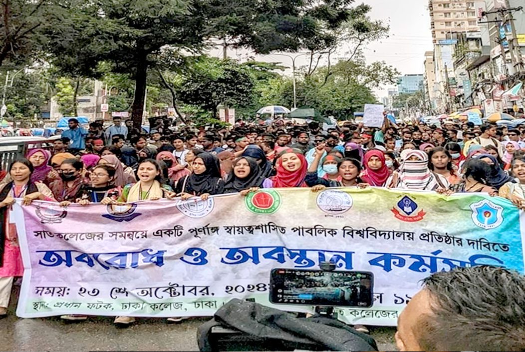 মঙ্গলবার (২৯ অক্টোবর) দুপুর ১২টার দিকে রাজধানীর ঢাকা কলেজের সামনে থেকে একটি মিছিল নিয়ে সায়েন্সল্যাব মোড় অবরোধ করে শিক্ষার্থীরা। এরপর তারা সেখানেই আন্দোলন শুরু করেন। এ সময় স্বায়ত্তশাসিত বিশ্ববিদ্যালয় প্রতিষ্ঠার দাবিতে নানা নানা স্লোগান দিতে থাকে শিক্ষার্থীরা। ৭ কলেজের বিষয়ে কোনও কমিটি নয়, কমিশন গঠনের দাবি জানান আন্দোলনকারীরা। স্বায়ত্তশাসিত বিশ্ববিদ্যালয় প্রতিষ্ঠার জন্য শিক্ষা কমিশন গঠন না করা হলে আরও কঠোর কর্মসূচি ঘোষনা করা হবে বলেও জানান আন্দোলনকারী শিক্ষার্থীরা।