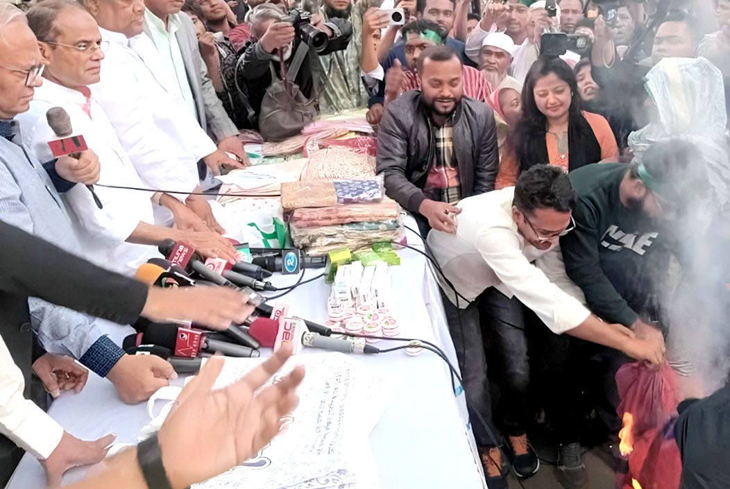 জাতীয় প্রেস ক্লাবের সামনে ভারতীয় শাড়ি রাস্তায় ফেলে আগুনে পুড়িয়েছেন বিএনপির সিনিয়র যুগ্ম মহাসচিব রুহুল কবির রিজভী। আগরতলায় বাংলাদেশের সহকারী হাইকমিশনে হামলা ও ভারতে বাংলাদেশের পতাকা অবমাননার প্রতিবাদে এই প্রতিক্রিয়া দেখান তিনি।