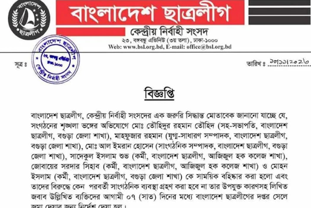 ছাত্রলীগের কেন্দ্রীয় কমিটির সভাপতি সাদ্দাম হোসেন, সংবাদ বিজ্ঞপ্তিতে বলেন, ছাত্রলীগের কেন্দ্রীয় নির্বাহী সংসদের জরুরি সিদ্ধান্ত মোতাবেক সংগঠনের শৃঙ্খলা ভঙ্গের অভিযোগে ৬ নেতাকর্মীকে সংগঠন থেকে সাময়িক বহিষ্কার করা হয়েছে। এছাড়াও তাদের বিরুদ্ধে কেন পরবর্তী সাংগঠনিক ব্যবস্থা গ্রহণ করা হবে না তার উপযুক্ত কারণ লিখিতভাবে আগামী ৭ দিনের মধ্যে বাংলাদেশ কেন্দ্রীয় ছাত্রলীগের দপ্তর সেলে জমা দিতে বলা হয়েছে।