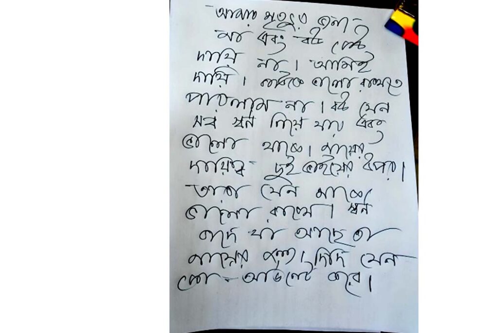 ঘটনাস্থলে পলাশ সাহার টেবিলে একটি চিরকুট পাওয়া গেছে। সেখানে লেখা ছিল, ‘আমার মৃত্যুর জন্য মা ও বউ কেউ দায়ী না। আমিই দায়ী। কাউকে ভালো রাখতে পারলাম না। আমার বউ যেন সব সেনা নিয়ে যায় ও ভালো থাকে। আমার মায়ের দায়িত্ব দুই ভাইয়ের ওপর, তারা যেন মাকে ভালো রাখে। সোনা বাদে যা কিছু আছে তা সব মায়ের জন্য। এ বিষয়ে দিদি যেন কো-অর্ডিনেট করে।