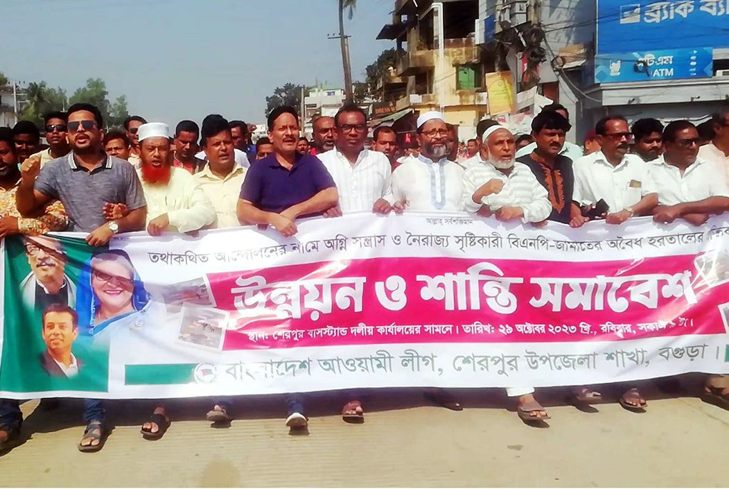 রোববার (২৯ অক্টোবর) বেলা ১১টায় ঢাকা-বগুড়া মহাসড়কে শেরপুরে আওয়ামীলীগ সাধারণ সম্পাদক সুলতান মাহমুদের নেতৃত্বে এবং অন্যদিকে যুবলীগের সভাপতি তারিকুল ইসলাম তারেক ও সাধারণ সম্পাদক মোস্তাফিজার রহমান ভুট্টোর নেতৃত্বে মিছিল বের করা হয়। এ সময় হরতাল বিরোধী মিছিলে অংশ নেওয়া নেতাকর্মীরা বিএনপি জামায়াত বিরোধী বিভিন্ন স্লোগান দিতে থাকে।