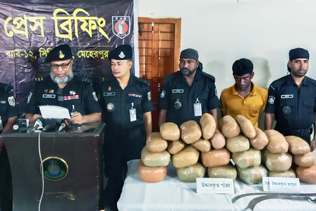 মেহেরপুর সীমান্তে গাঁজা উদ্ধারের বিষয়ে র্যাব-১২ এর মেহেরপুর ক্রাইম প্রিভেনশন কোম্পানি-৩ এর গাংনী ক্যাম্পের কমান্ডার সহকারী পুলিশ সুপার মো: এনামুল হক জানিয়েছেন, গোপন সংবাদের ভিত্তিতে র্যাবের একটি দল রাকিবের বাড়িতে অভিযান পরিচালনা করে। এ সময় রাকিবের বাড়ির বিভিন্ন ঘর, উঠানসহ অন্যান্য জায়গা থেকে মোট ২৬টি প্যাকেটে মোড়ানো গাঁজার প্যাকেট উদ্ধার করা হয়। এছাড়া তার ঘরের ভেতর থেকে ২টি ধারালো অস্ত্র হাসুয়া পাওয়া যায়। উদ্ধারকৃত গাঁজার আনুমানিক মূল্য ১০ লক্ষ ৮০ হাজার টাকা।