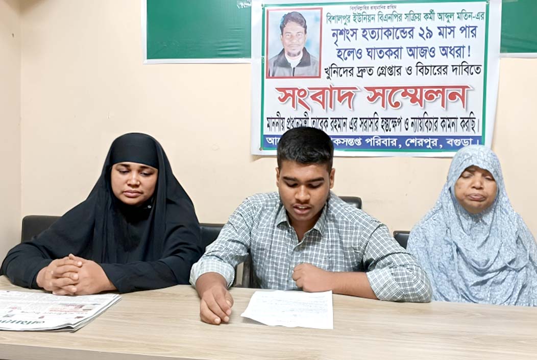 বগুড়ার শেরপুর উপজেলার বিশালপুর ইউনিয়ন বিএনপির কর্মী আব্দুল মতিন (৬০) হত্যাকাণ্ডের ২৯ মাস অতিবাহিত হলেও ঘাতকরা গ্রেপ্তার না হওয়ায় সংবাদ সম্মেলন করেছে নিহতের পরিবার।