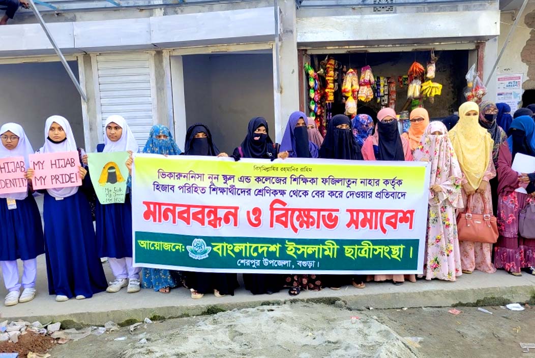 ভিকারুননিসা নূন স্কুল অ্যান্ড কলেজের শিক্ষিকা ফজিলাতুন নাহার হিজাব পরিহিত শিক্ষার্থীদের শ্রেণিকক্ষ থেকে বের করে দেওয়ার ঘটনার প্রতিবাদে বগুড়ার শেরপুরে মানববন্ধন ও বিক্ষোভ সমাবেশ করেছে বাংলাদেশ ইসলামী ছাত্রীসংস্থা।