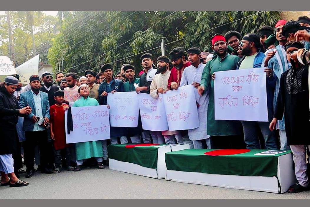 তুমি কে, আমি কে হাদি হাদি, হাদি ভাইয়ের রক্ত বৃথা যেতে দেবো না, খুনি ও হত্যার বিচার চাই, প্রশাসন জবাব চাই সহ বিভিন্ন স্লোগান দেন বিক্ষুদ্ধ জনতা।