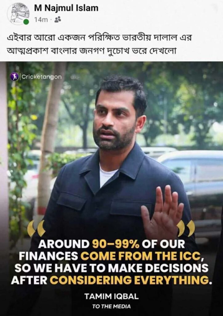 বৃহস্পতিবার (০৮ জানুয়ারি) তামিম ইকবাল বিশ্বকাপ ইস্যুতে নিজের অবস্থান তুলে ধরেন। সেই বক্তব্যের একটি ফটোকার্ড ফেসবুকে শেয়ার করে বিসিবির অর্থ কমিটির চেয়ারম্যান নাজমুল ইসলাম লেখেন, ‘এইবার আরো একজন পরিক্ষিত (পরীক্ষিত) ভারতীয় দালাল এর আত্মপ্রকাশ বাংলার জনগণ দুচোখ ভরে দেখলো।’ মন্তব্যটি ঘিরে সামাজিক মাধ্যমে তীব্র সমালোচনা শুরু হলে পরে পোস্টটি মুছে ফেলা হয়।